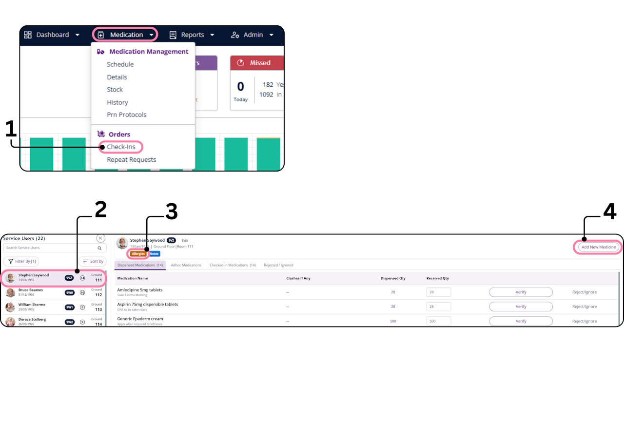 In the Portal click on the 'Medication' tab at the top of the screen and then select 'Check-Ins' from the drop down menu