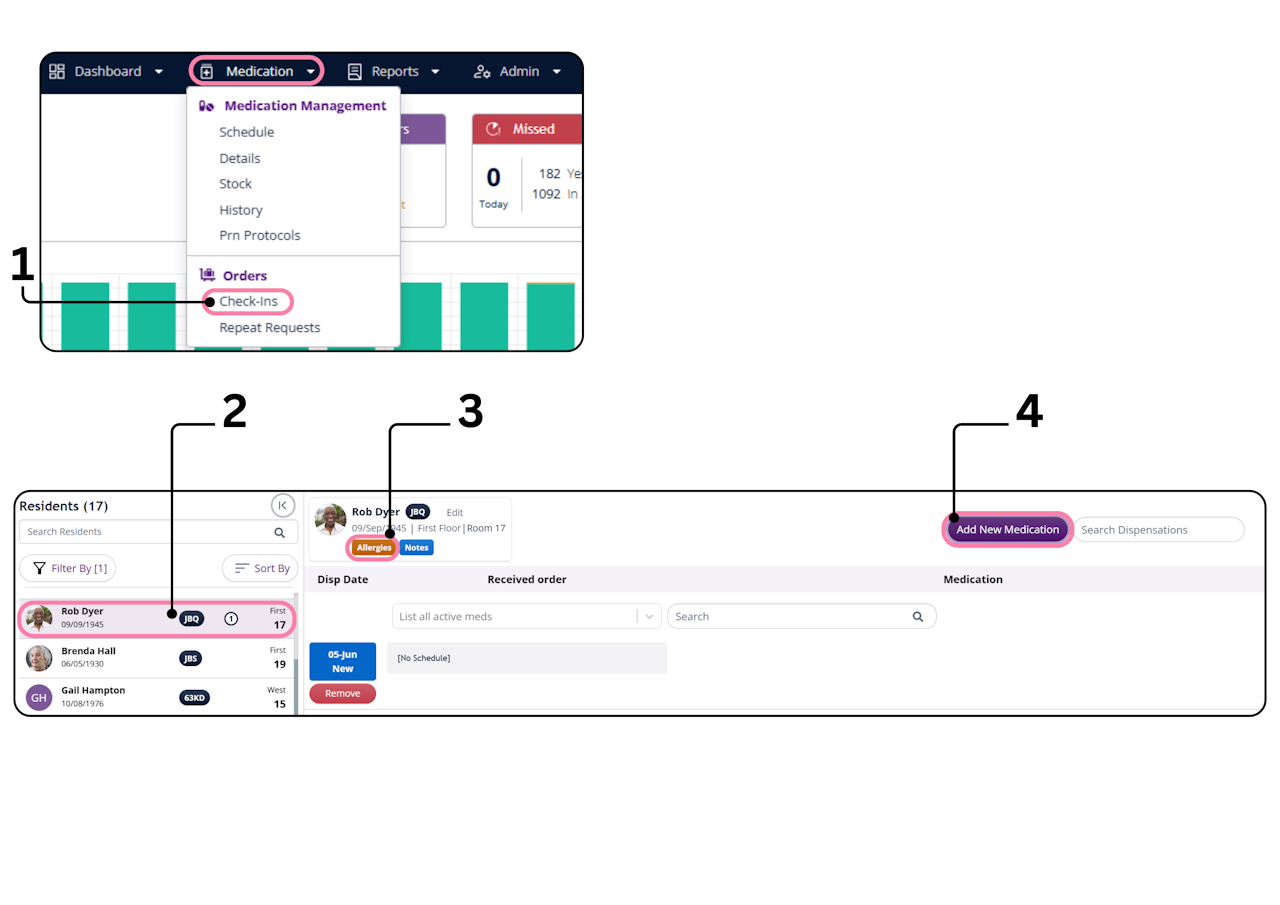 Click on the Medication tab at the top of the screen, then select Check-Ins from the dropdown menu.