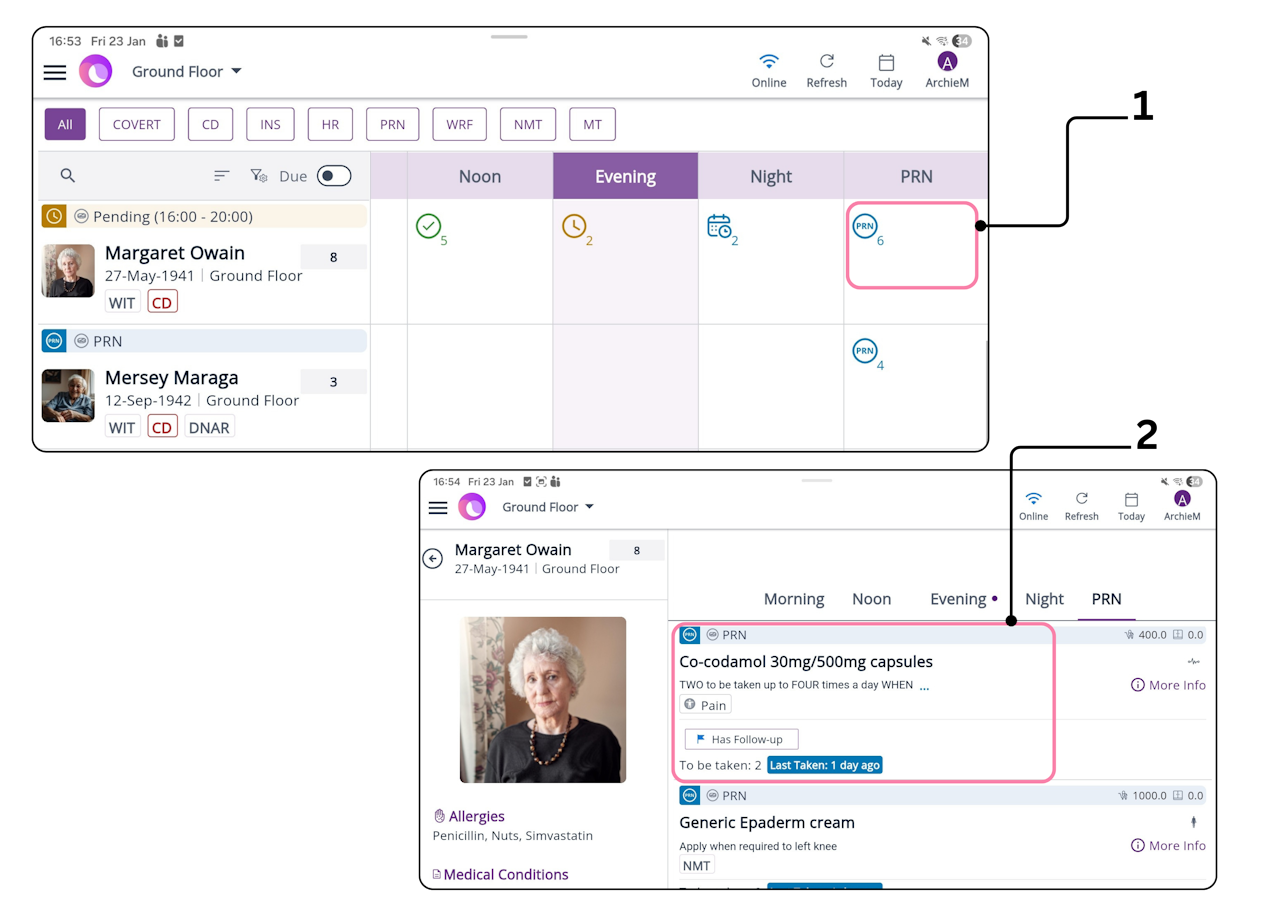 Press on the PRN icon within the 'PRN' column on the MAR Status Screen