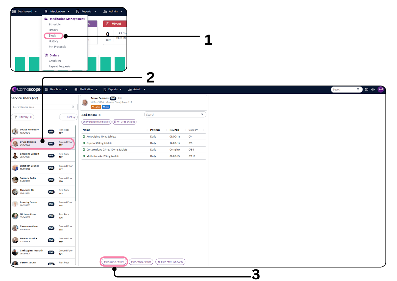 The Bulk Action feature allows you to perform multiple stock-related tasks at once. You can use it for bulk stock amendments, bulk audit actions, and bulk printing of QR codes (if any medications are QR code-enabled).
