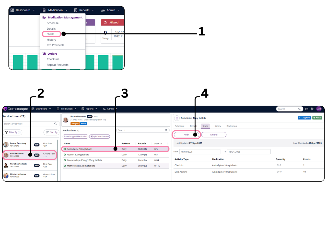 Find the medication you wish to amend and click on it. The stock activity panel for that item will open on the right-hand side of the screen, displaying all related stock movements.