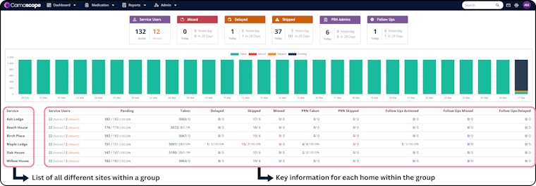 The eMAR dashboard displays a real-time snapshot of the medication status within a home.