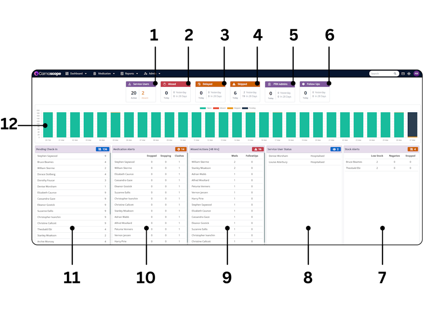 Medication Alerts: flags potential medication clashes (when more than one medication for that resident has the same active ingredient). This also shows stopped and stopping medicines