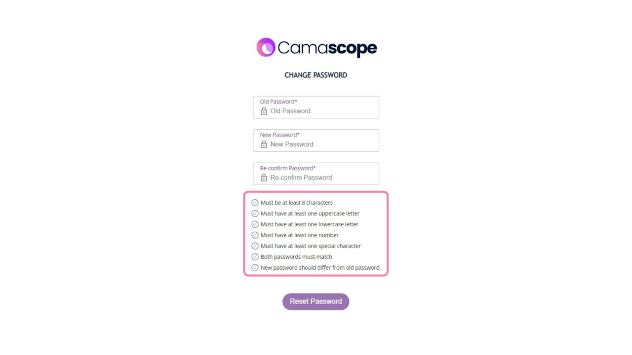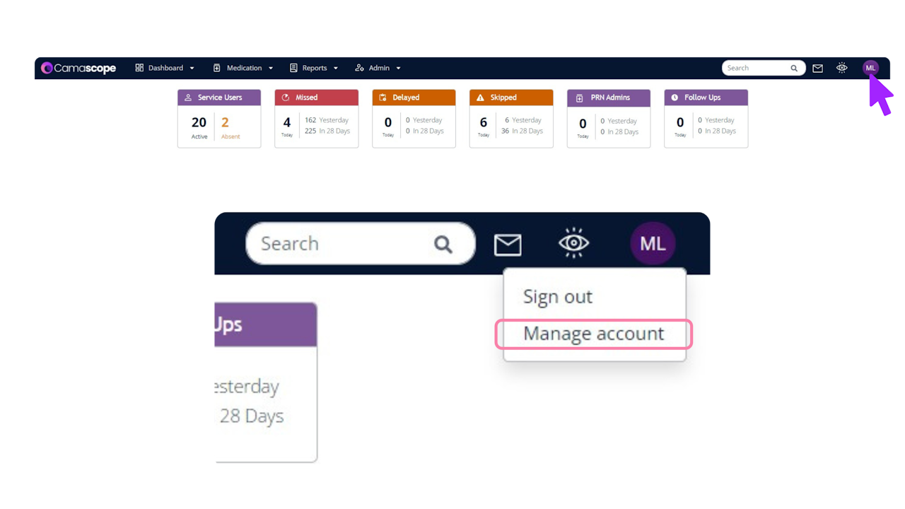 Firstly, log in to the Camascope Portal. Once logged in, click on your initials in the top right-hand corner.