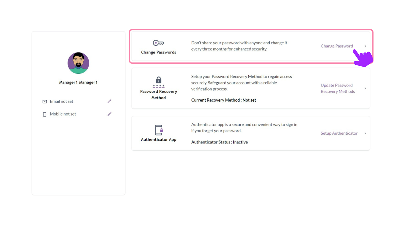 Selecting ‘Change Password’ prompts for the current password before allowing the creation of a new one. Instructions will guide you through entering and confirming the new password.