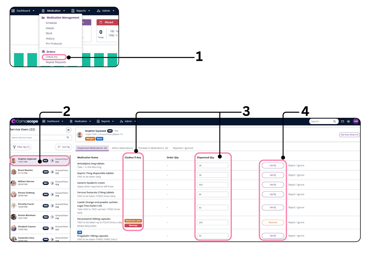 Once medication has been delivered by the pharmacy, it must be checked in using the Camascope system to ensure accurate stock records and safe administration.