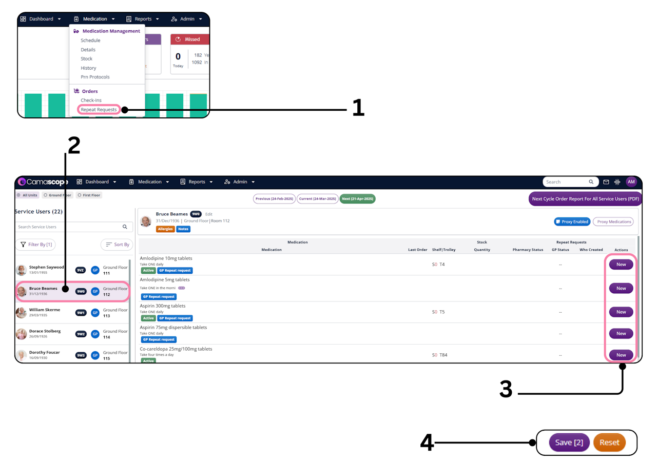 The Camascope system allows you to order medications efficiently and with ease. Follow the steps below to request repeat medications for the upcoming cycle: