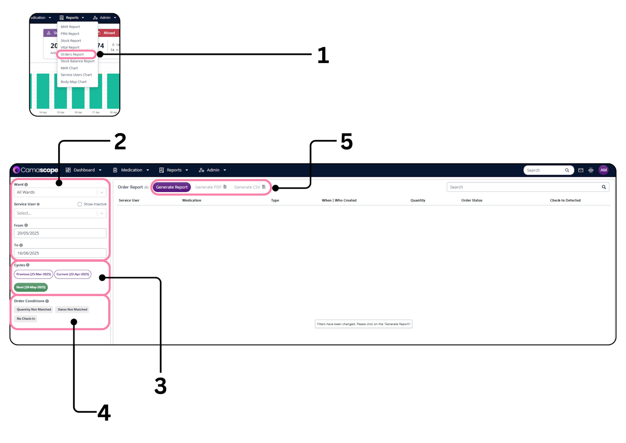 Click on the Reports tab at the top of the screen, then select Orders Report from the dropdown menu.