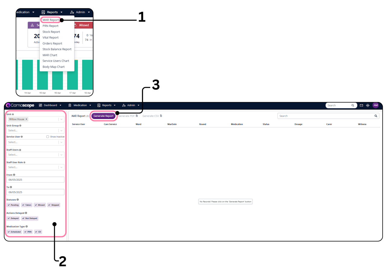 Press on the 'Reports' button at the top of the screen in the Portal. Then select 'MAR Report' from the drop down menu
