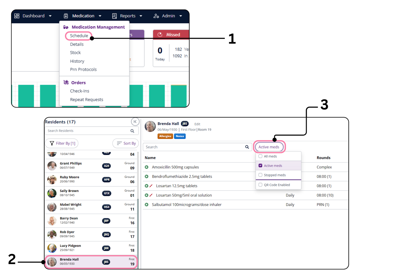 Select 'Medication' at the top of the screen and then select 'Schedule' from the drop down menu