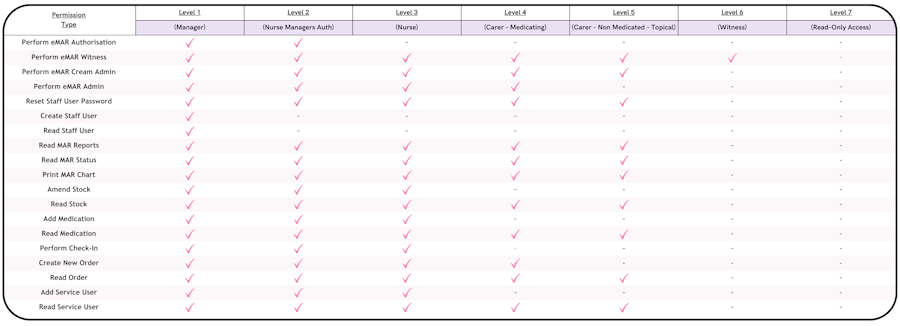 Can witness medication actions where required, but cannot perform or initiate them independently.Level 7: Read-Only Access