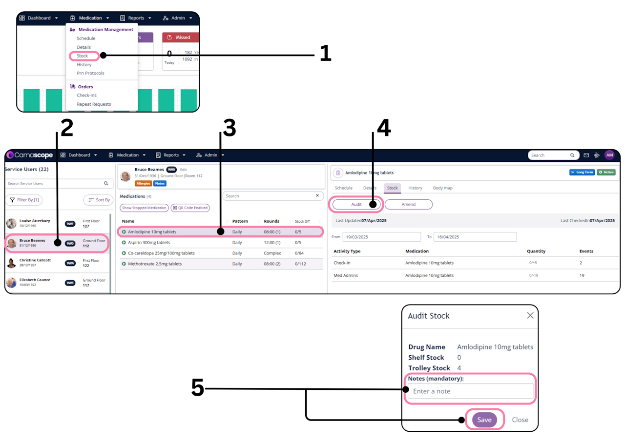 Locate the medication you wish to audit and click on it. This will open the stock page on the right-hand side, displaying the full stock activity history for that item.