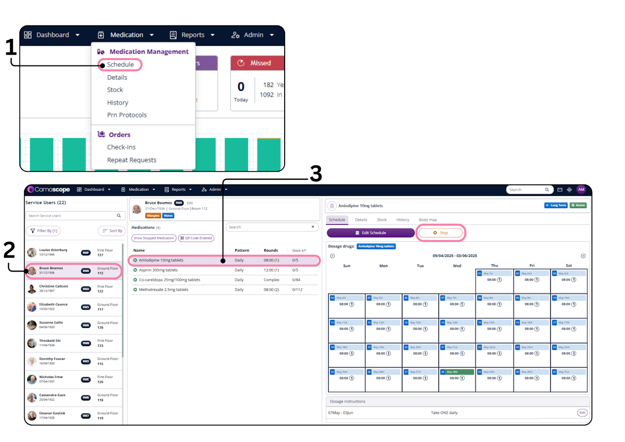 Next to edit schedule there is a Stop button. Click this top stop a medicine